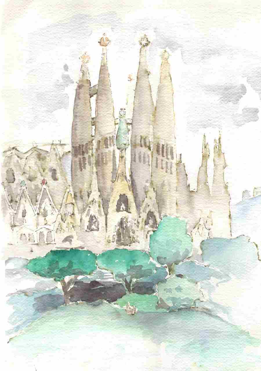 Die Sagrada Familia in Barcelona ist wohl die interessanteste Baustelle der Welt. In der Fassade der noch unfertigen Kirche kann man richtig lesen. Für mich bestand die Herausforderung darin, die komplizierte Architektur in ein Aquarell umzusetzen.