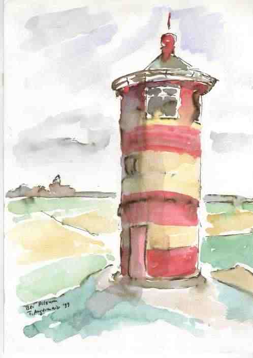 Der 'Otto-Leuchtturm' bei Pilsum. Einer der überraschendsten Momente: Während dieses Auqarell entstand, blickte mir eine japanische Fernsehkamera über die Schulter.