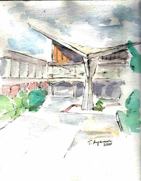 Ansicht des Innenhofes der Fachhochschule. Gemalt nach dem Ende der Prüfungszeit und verwendet als Hintergrund für die Plakate der FH zur ufra2000.